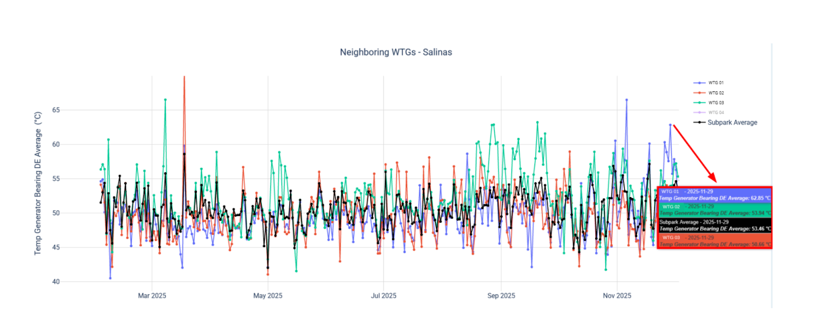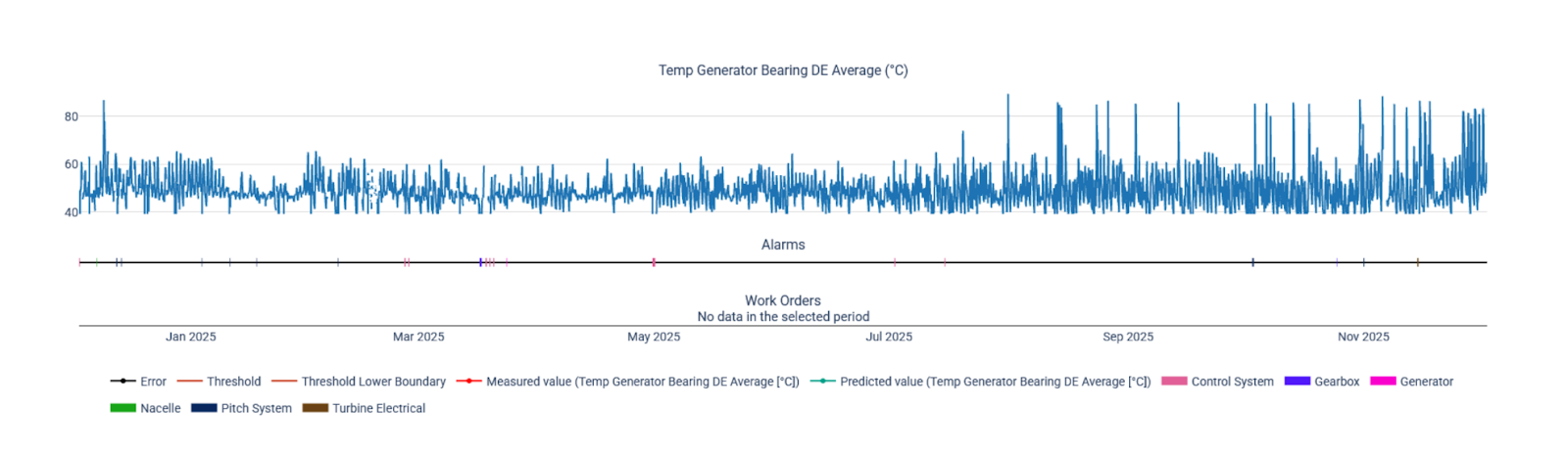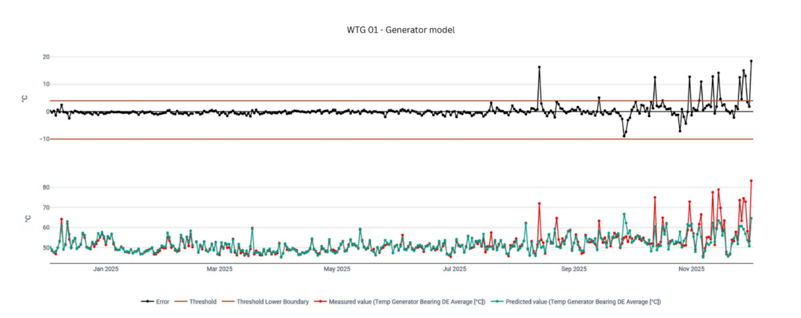 The Suzlon turbine, located in the subparque of one of our clients, began to show subtle temperature deviations in the generator coupling bearing, starting on August 13, 2025.
