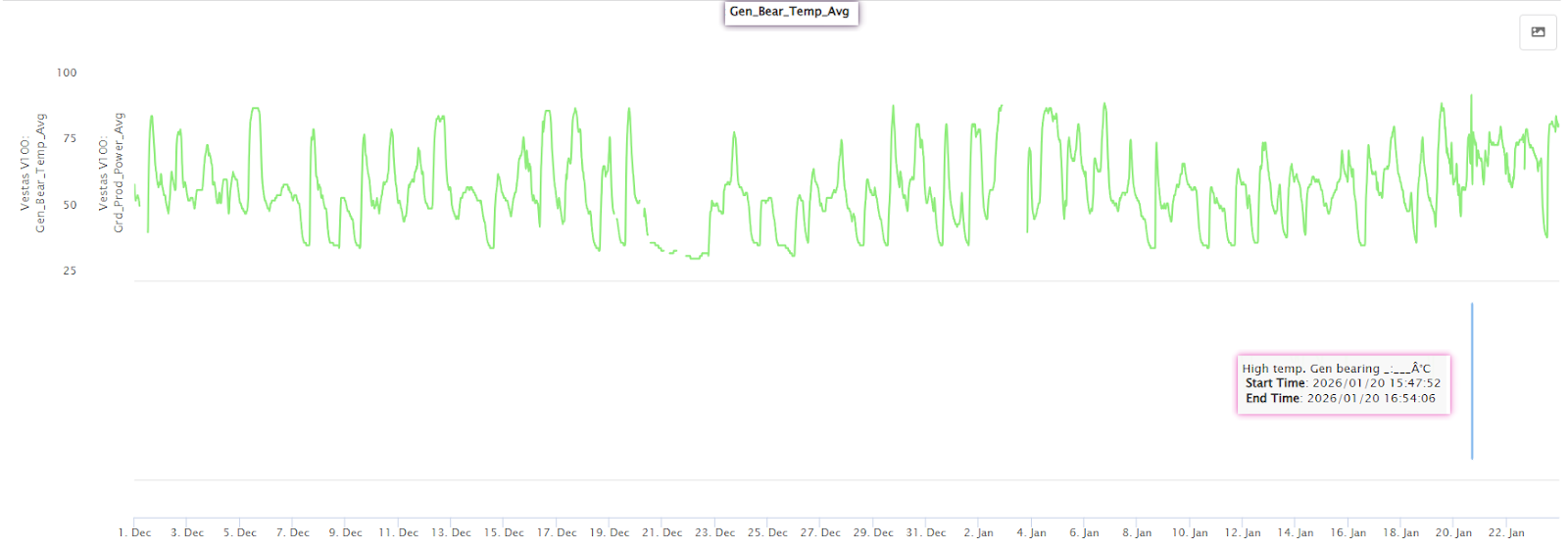 Em janeiro de 2026, a situação tornou-se ainda mais evidente em nível de parque: ao ser comparada com as demais turbinas vizinhas do subparque, a turbina em questão destacou-se isoladamente como a máquina operando com a temperatura mais alta neste componente.